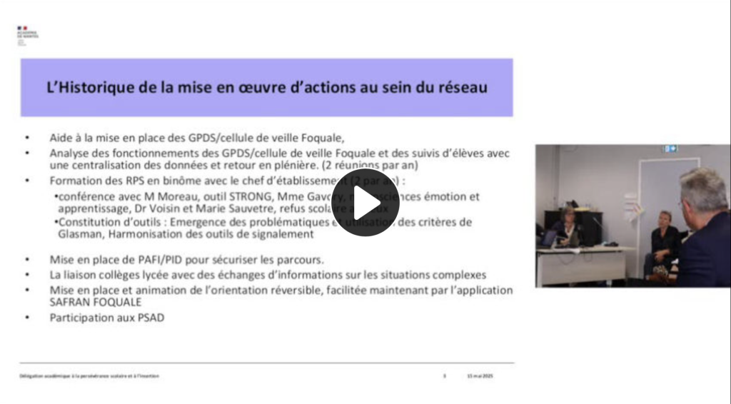 Le jeudi 15 mai, la Délégation académique à la persévérance scolaire et à l’insertion (DAPSI) a réuni les membres des comités FOQUALE pour discuter des initiatives de lutte contre le décrochage scolaire et promouvoir la persévérance des élèves au sein de l’ensemble des 15 réseaux FOQUALE.